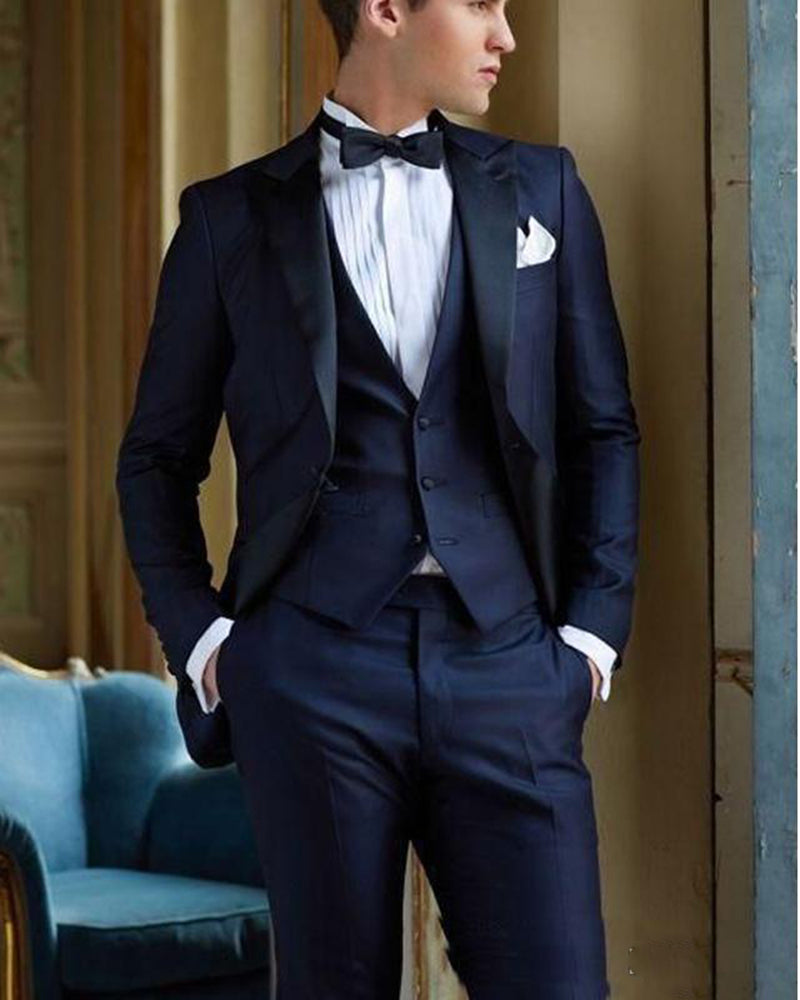 Smoking de mariage italien bleu marine sur mesure pour homme, coupe slim, ensemble 3 pièces avec blazer (veste, gilet, pantalon, cravate)