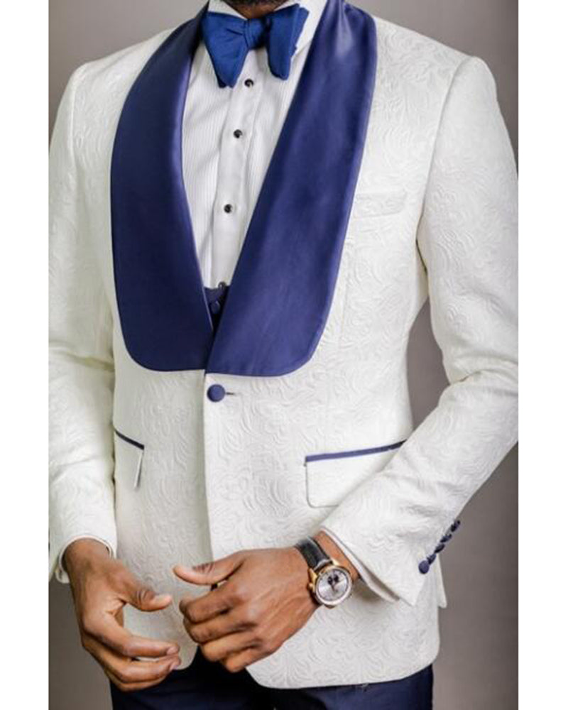 Costumes de mariage en jacquard ivoire pour hommes avec revers bleu, derniers smokings de bal 2 pièces (veste + pantalon) CB784