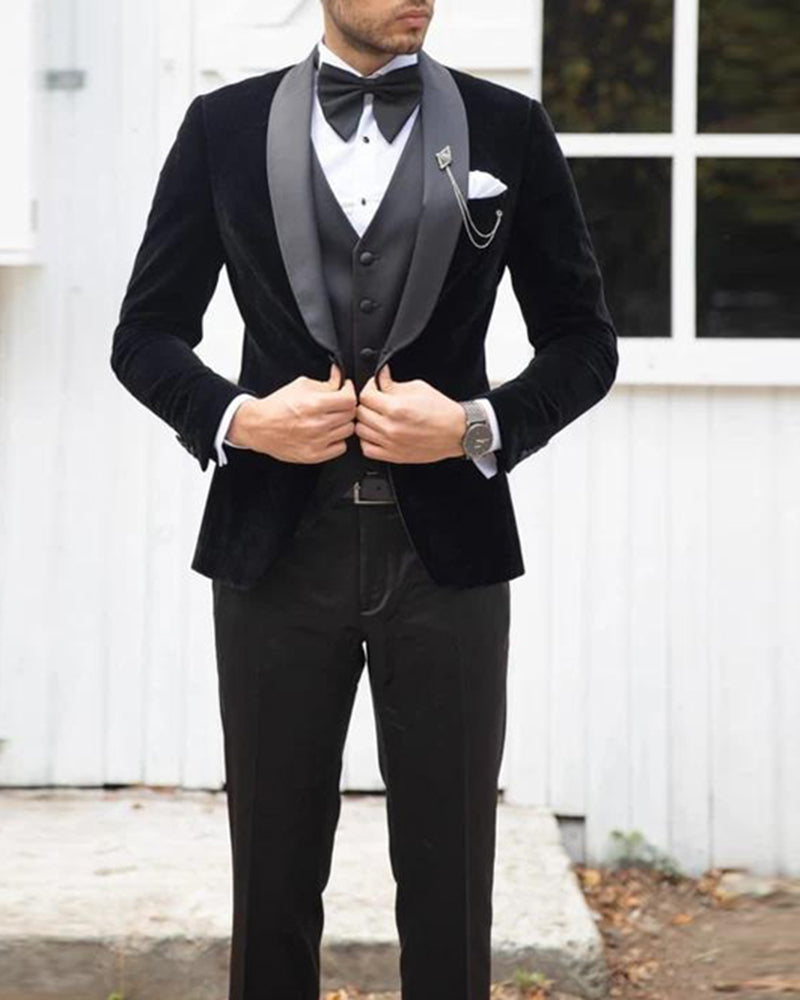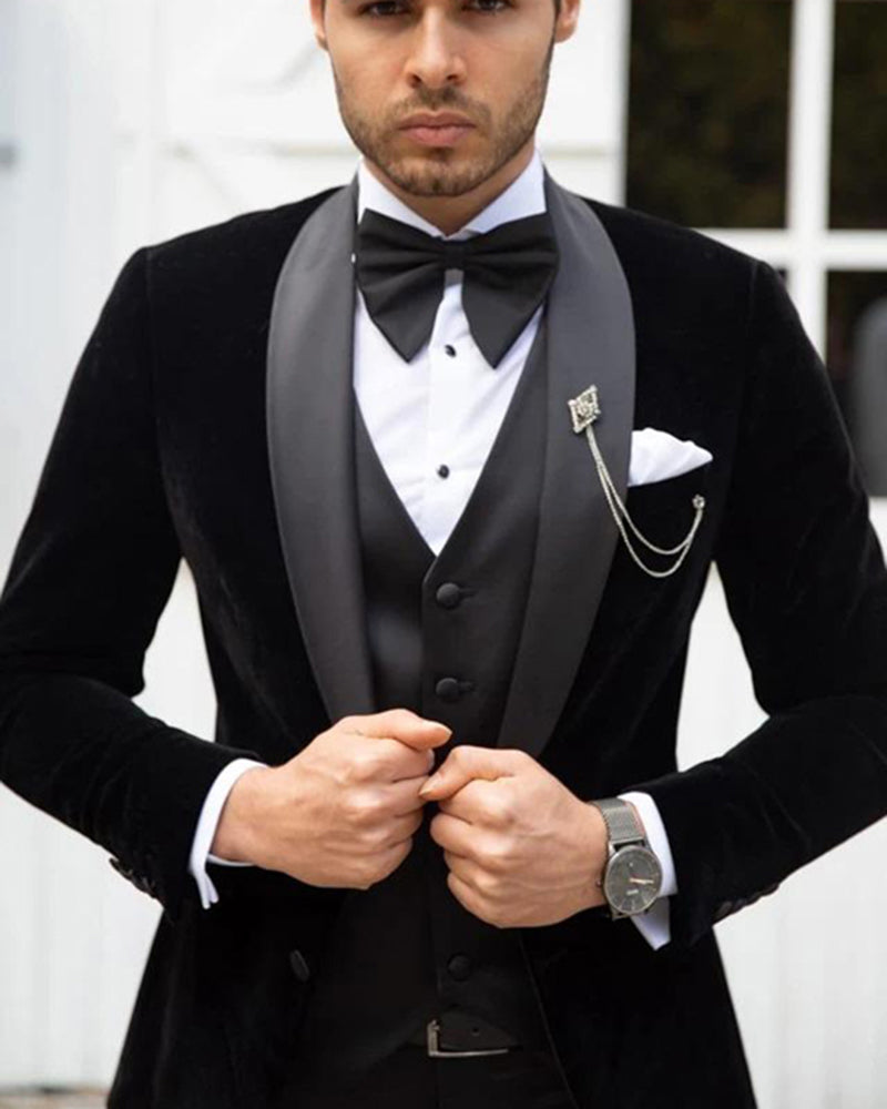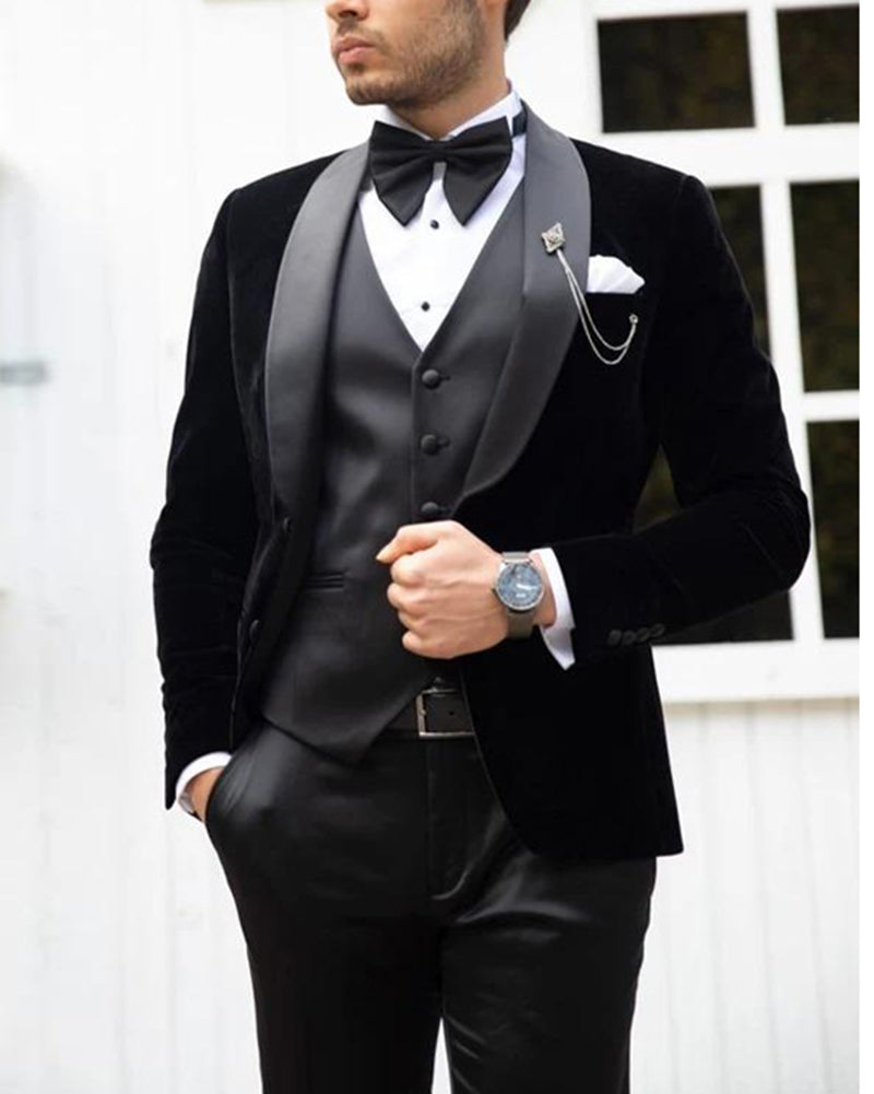 Costumes de mariage en velours noir à revers châle Classyby pour hommes, smoking de bal en velours 3 pièces CB2284