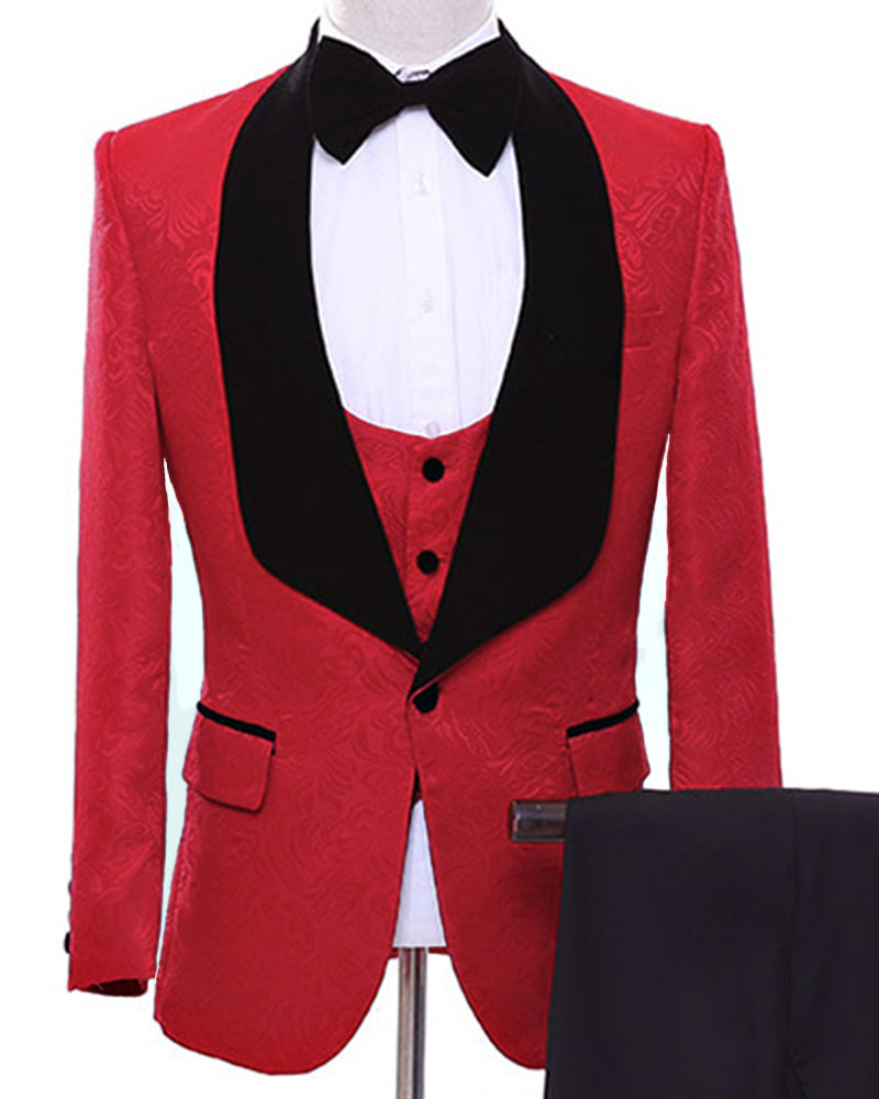 Costume de smoking rouge élégant avec bordure en velours noir 3 pièces pour marié CB1105
