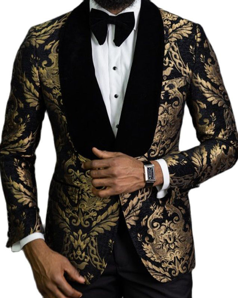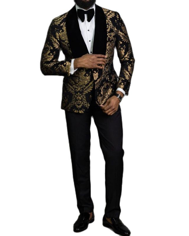 Costume de smoking de mariage à motif jacquard noir et or pour homme CB95183