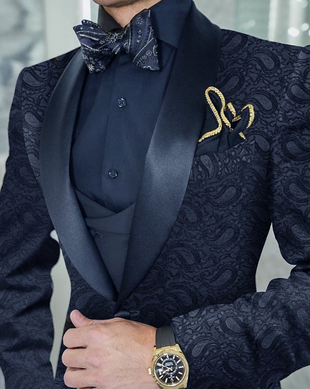 Smoking de mariage à motifs bleu marine, veste de marié 3 pièces, blazer + gilet + pantalon CS1115