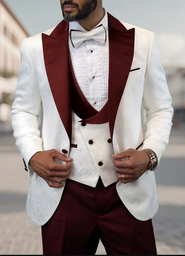 Smoking de marié en jacquard ivoire avec revers bordeaux 3 pièces CS