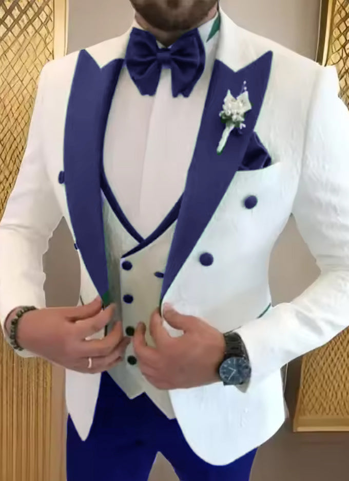 White Groom Wedding Tuxedo Pattern with Blue Lapel 3 Pieces CS58
