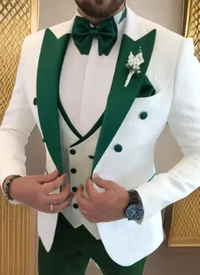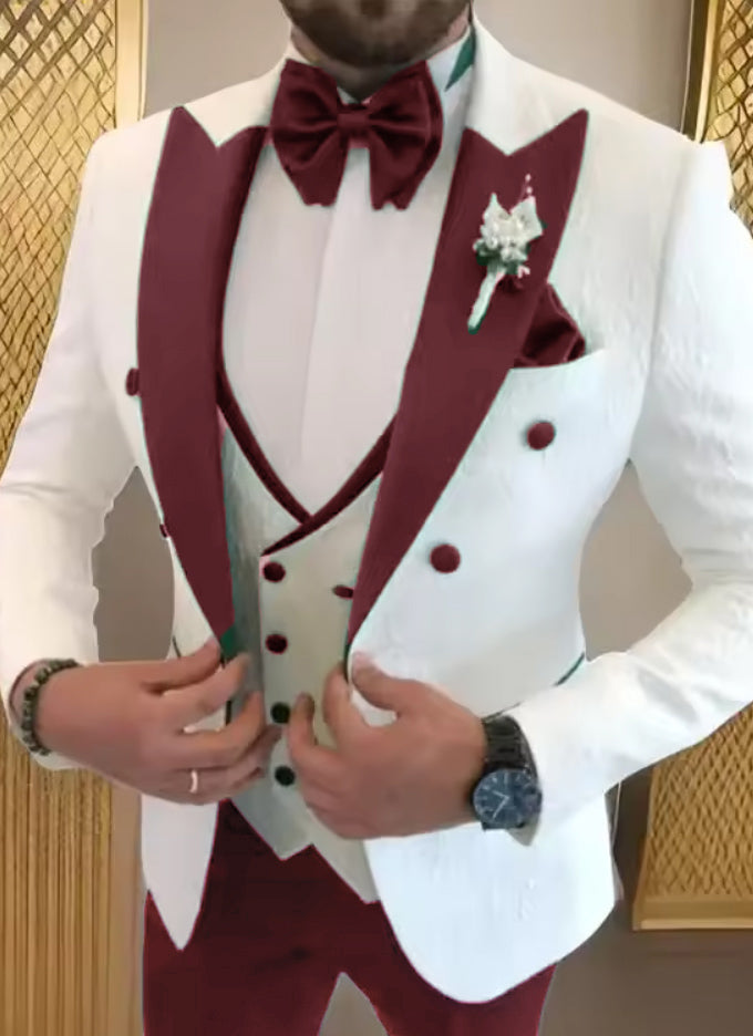 Make a grand entrance in our elegant white tuxedo featuring sharp peak lapels and a slim-fit silhouette that exudes sophistication. The refined patterned fabric adds subtle texture while maintaining timeless wedding elegance. Perfectly tailored for the modern groom, this luxurious ensemble combines comfort with impeccable style for your unforgettable walk down the aisle.