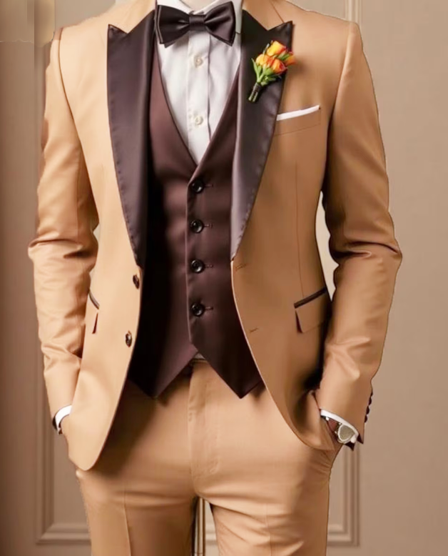 Chamapgne and Dark Brown Men Tuxedos 3 Pieces Wedding Party Dinner Jacket +vest +pants CS5624