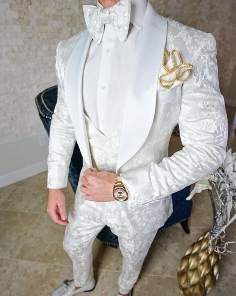 Costumes de smoking de marié blancs coupe slim à revers châle classiques à motif floral en jacquard pour hommes CB10405