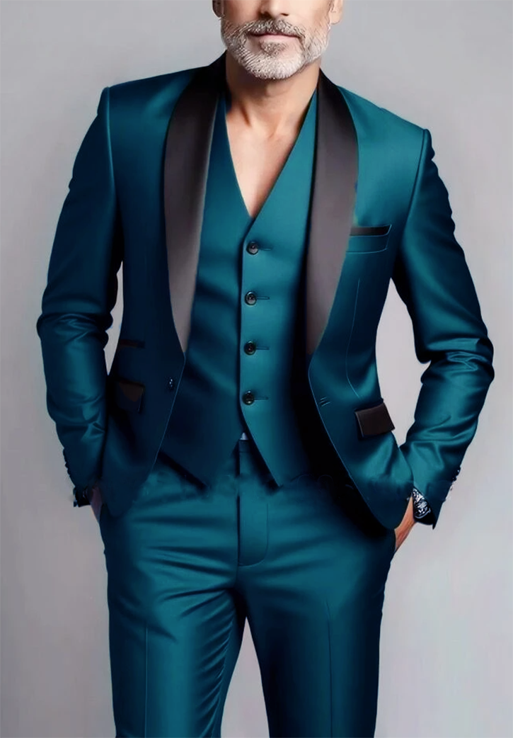 Classic Style 3 Piece Slim Fit Teal Blue Men Suit Groom Tuxedos Shawl Lapel Single Breasted Blazer Vest Pants Set Party Men Clothing CS9104