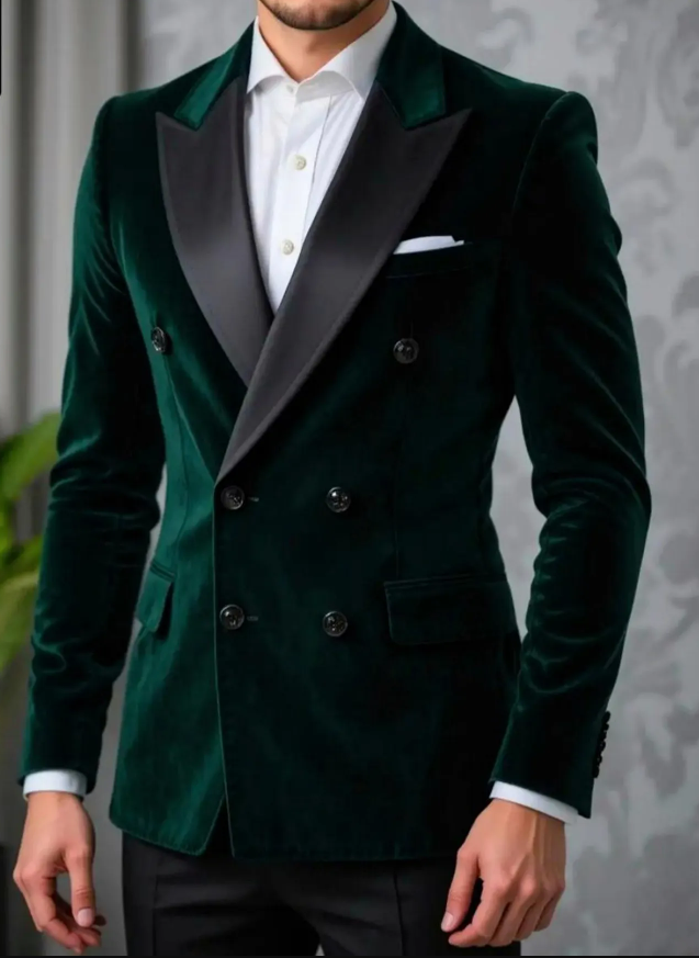 Double Breasted Dark Green Men's Velvet Wedding Tuxedo 2025 Jacket+Pants CS588