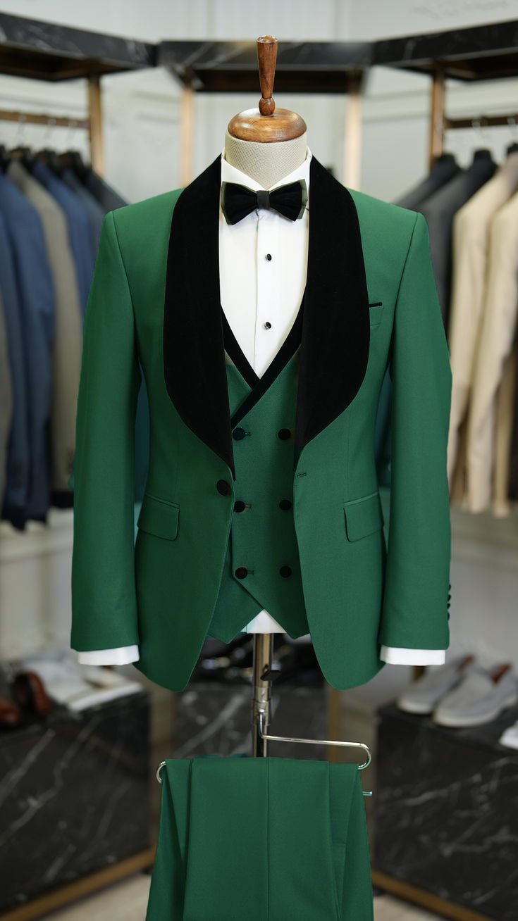 Get ready to turn heads in our?Green Tuxedos! Perfect for both?wedding tuxedo?and?prom tuxedo?events, the?shawl lapel?design exudes timeless elegance. This?3-piece?ensemble features a?slim fit?that complements every body type, crafted from premium materials for a sharp and polished look. Make a bold statement and stand out from the crowd with this stylish and sophisticated tuxedo!