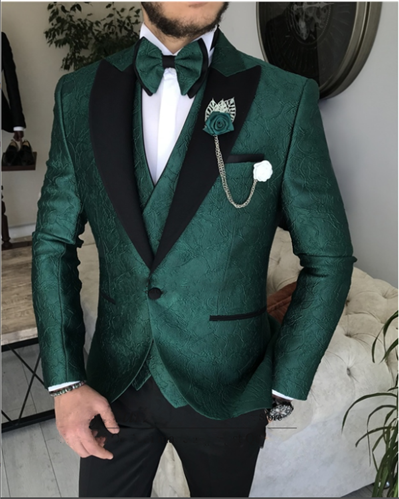 Smoking 3 pièces sur mesure en jacquard vert foncé pour homme pour mariage, smoking de bal pour soirée CB35153