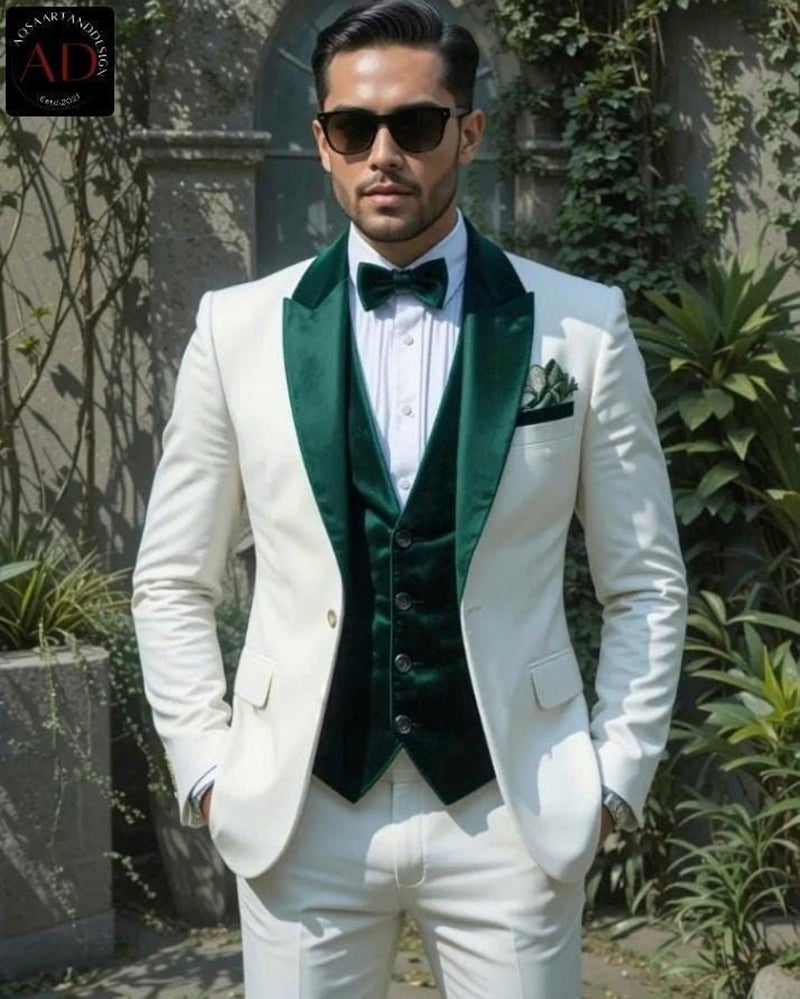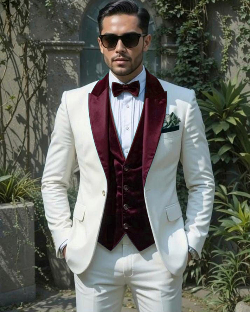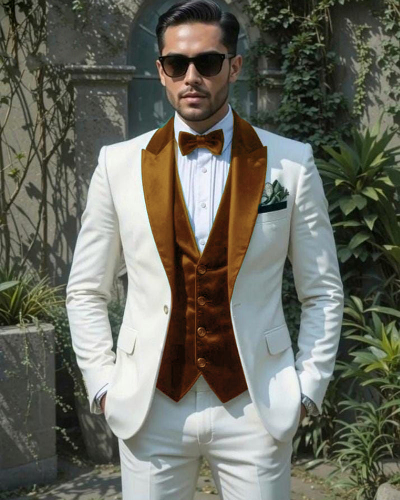 Velvet Lapel Wedding Groom Tuxedo Ivory Jacket Three Pieces One button Blazer CS7223