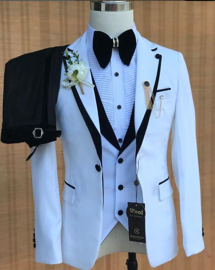 Smoking de mariage blanc et noir pour homme, costume de marié 3 pièces veste + gilet + pantalon