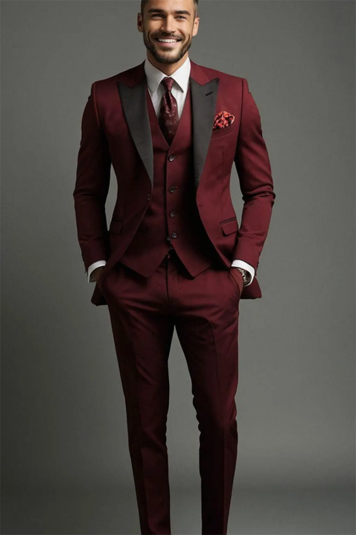 Burgundy Men Tuxs Prom wedding Tuxedo 3 Pieces with Black Peak Laple CB1030