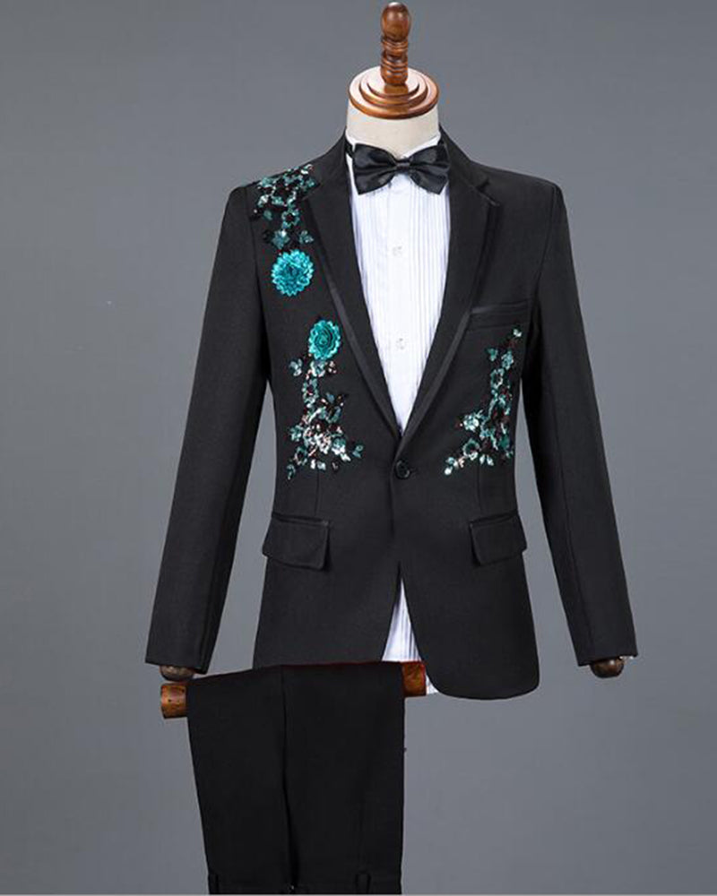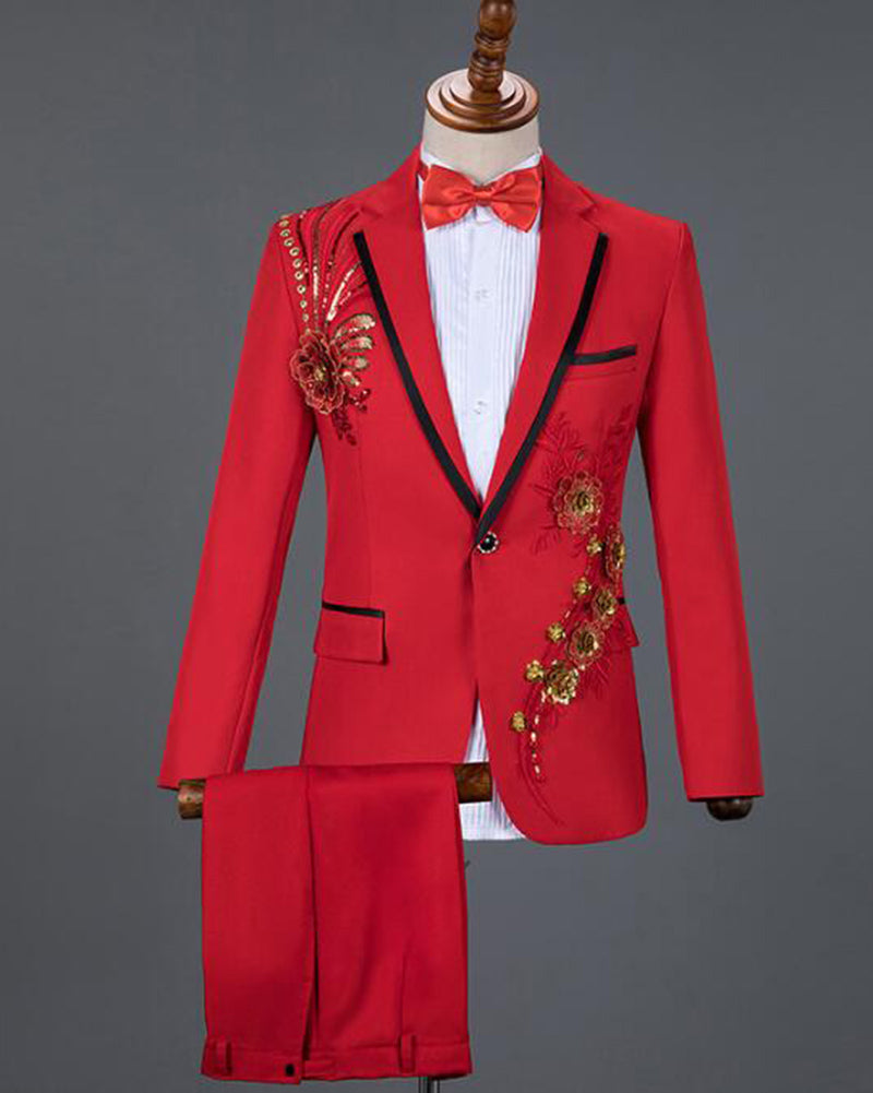 Red Sequin Embroidery Lace Floral Men Wedding Tuxedo One Button Stage Singer Costume CB07273